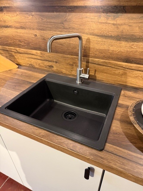 AEG Inductie Feel ,Inventum  koeler 88 cm, AEG Oven met Magnetronfunctie , Neff Schuine afzuigkap ,AEG vaatwasser en werkblad met zwarte spoelbak